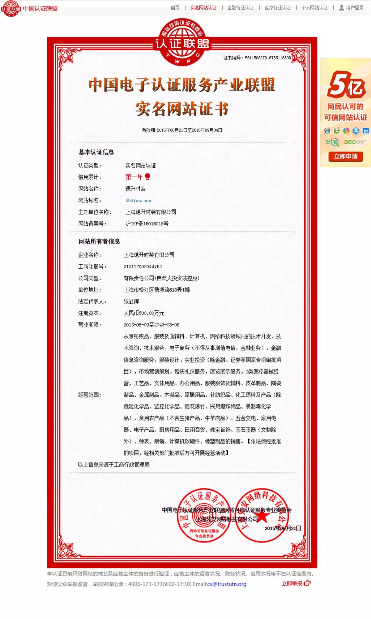由【中国管理科学研究所-行业发展研究所】、【中国国际经济技术合作促进会-企业发展中心】、【中国影响力】、【中国中小企业协会-信用管理中心】、【全国行业影响力人物(品牌)大型活动组委会】联合主办的 2015届全国行业影响力人物(品牌)大型宣传活动,根据网上公示、公众投票、行业权威信息比对,对入围企业(品牌)的“质量、服务、信誉、社会形象、知名度、对企业经济效益的拉动、对行业的影响,对我国经济的影响及其它影响力”等进行评价,授予德升时装两个金光闪闪的大奖牌: